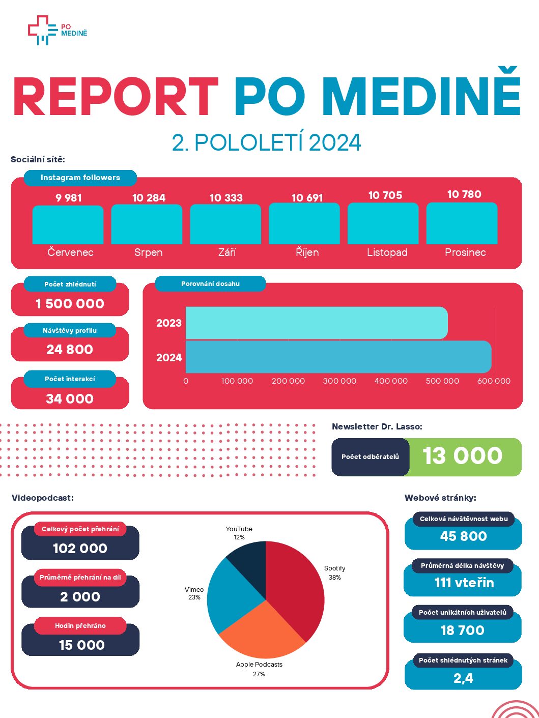Působíme na Spotify, YouTube, Apple a Vimeo. Vedle neplaceného podcastu jsme vytvořili i unikátní placený premium podcast s hosty, kteří jsou špičkami v oboru zdravotnictví. Tématy jsou: Leadership, data, technologie a podnikání v medicíně